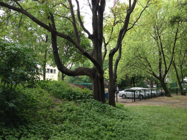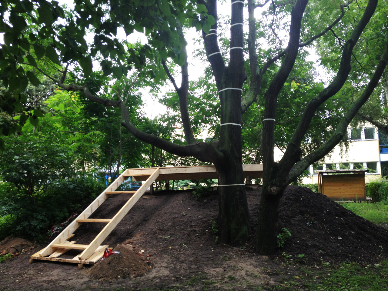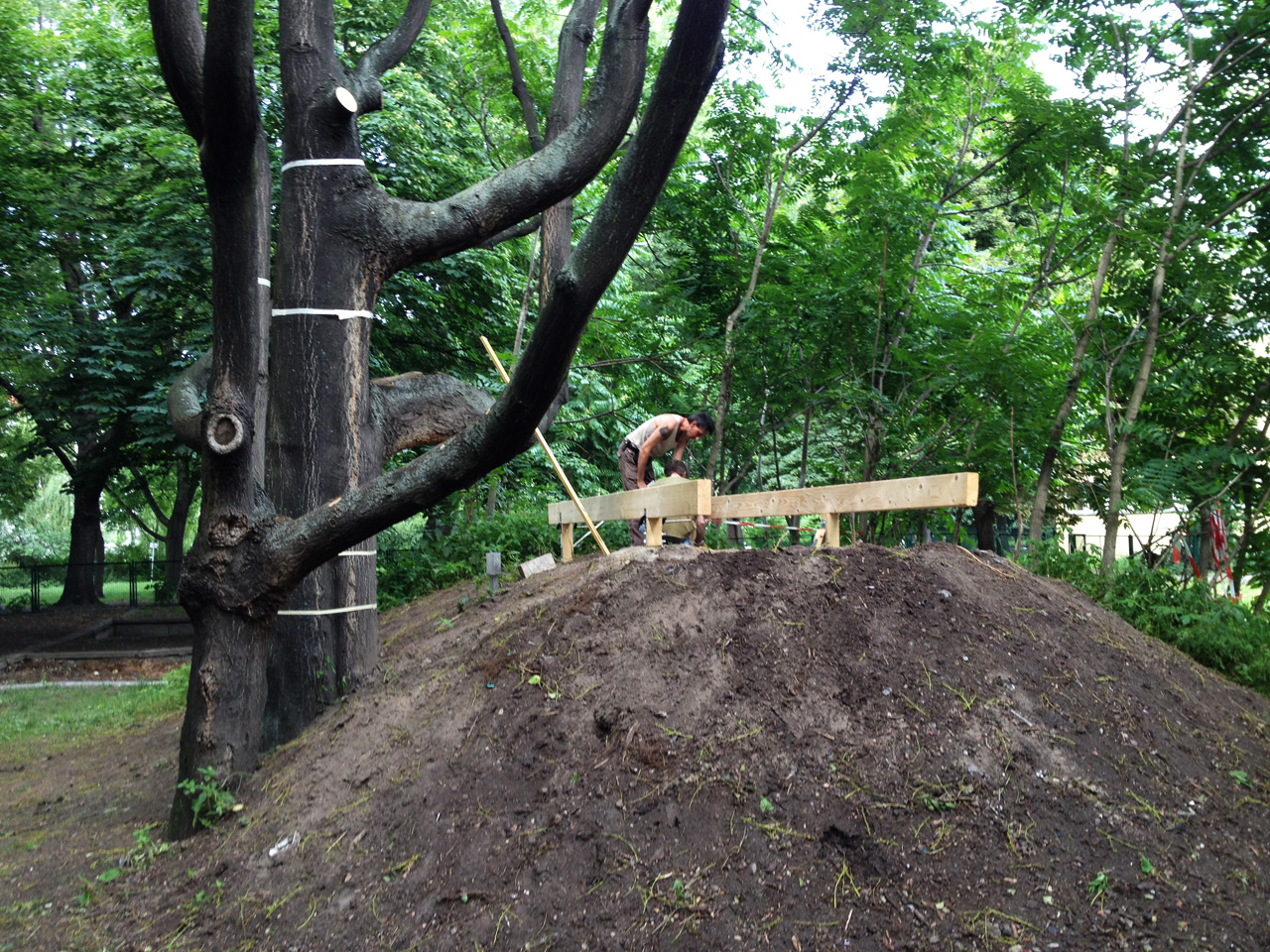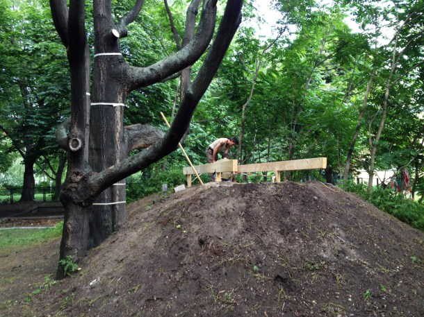 Baubeginn: Plattform 01 liegt auf dem aufgeschütteten Hügel neben dem Baum.