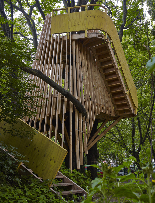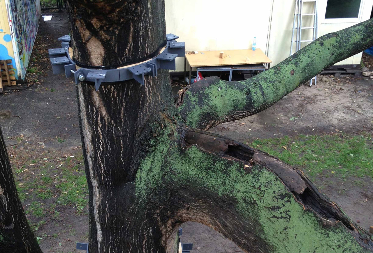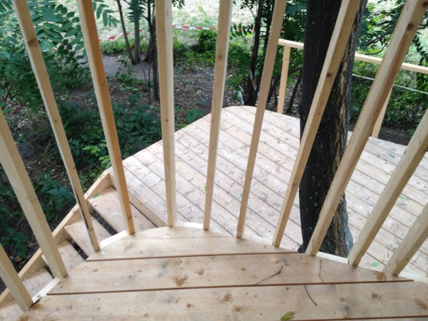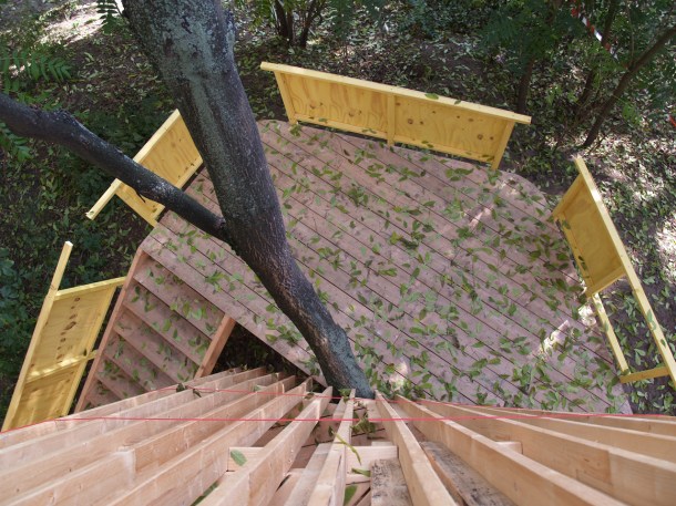 Plattform 01 am Baum. Die weißen Streifen am Baum dienen als Höhenmarkierungen für die Plattformen und die Kostruktionselemente.